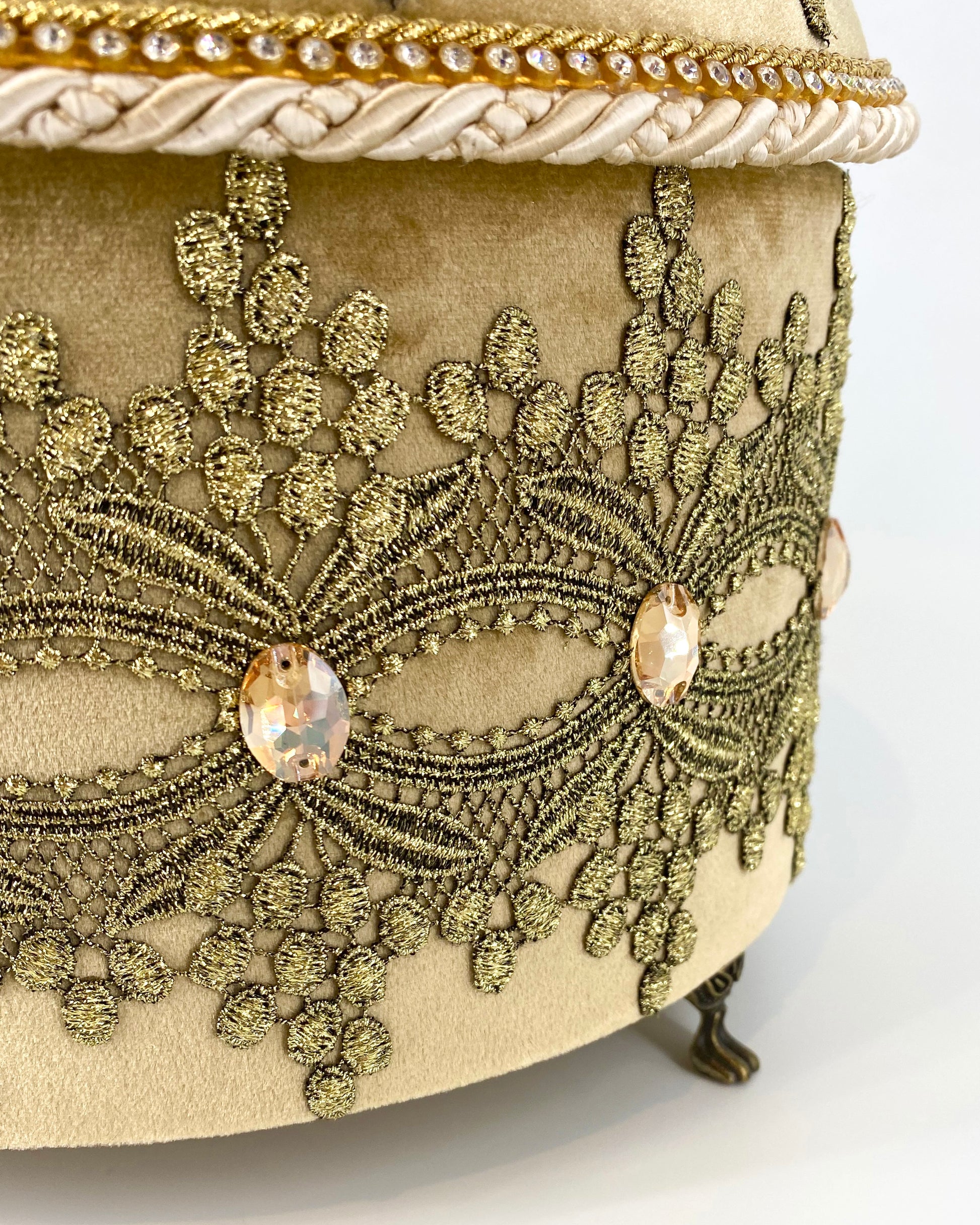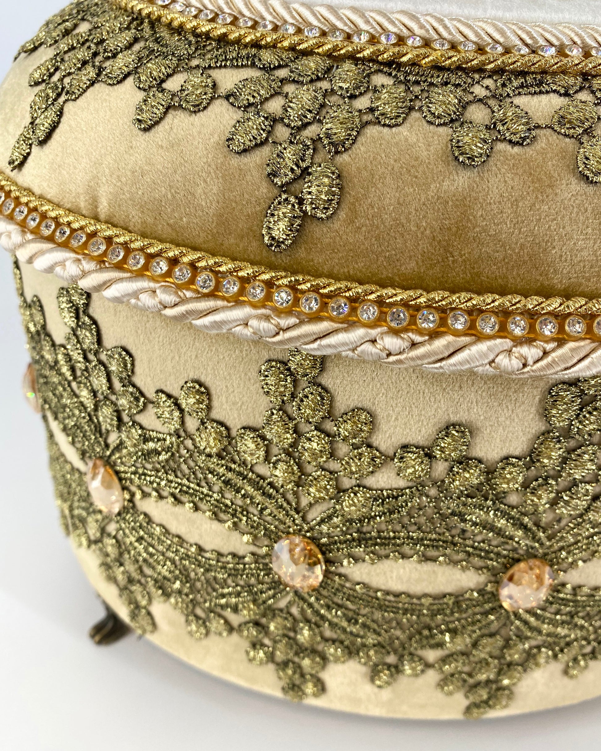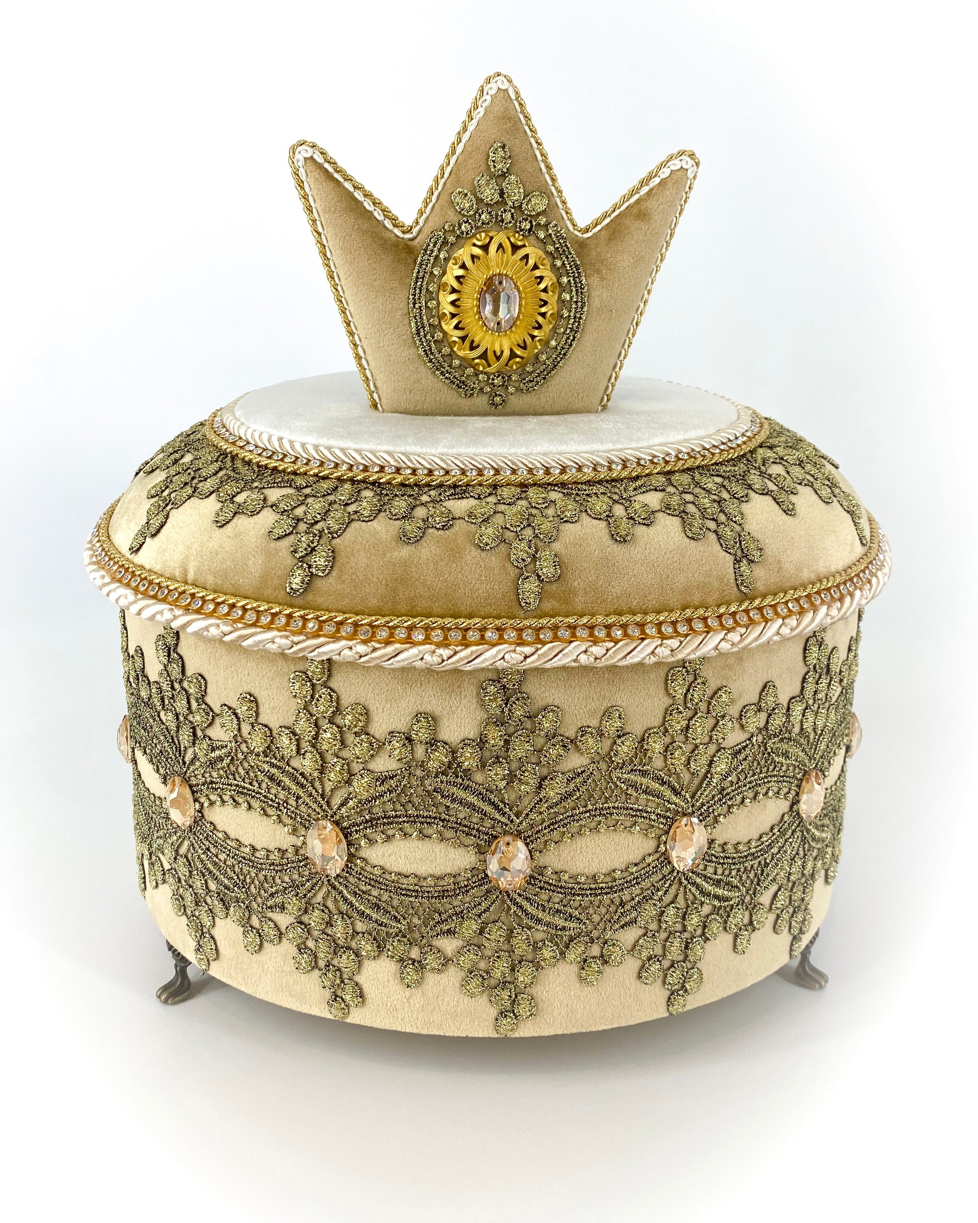 Handmade decorative box "Golden Queen", made using high quality fabrics, lace and Swarovski crystals.